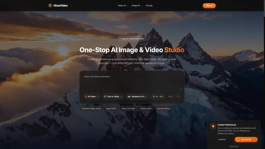 GlowVideo is a free AI video generator that transforms text and images into professional 4K videos instantly, with no editing skills required. Perfect for content creators, marketers, and anyone looking to make stunning videos.
