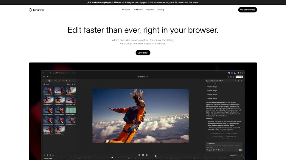 Diffusion Studio is an all-in-one online video editor that lets you create, edit, and export professional videos in your browser, with AI-assisted features and no installations required.