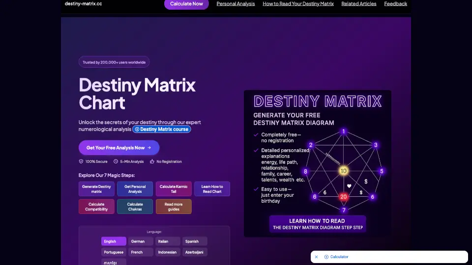 Destiny Matrix Chart是一款100%免费的命理分析工具,无需注册,输入生日即可秒算你的命运密码。通过神秘数字揭示你的生命路径、灵性蓝图和个人潜能,支持多种语言,全球20万+用户信赖。