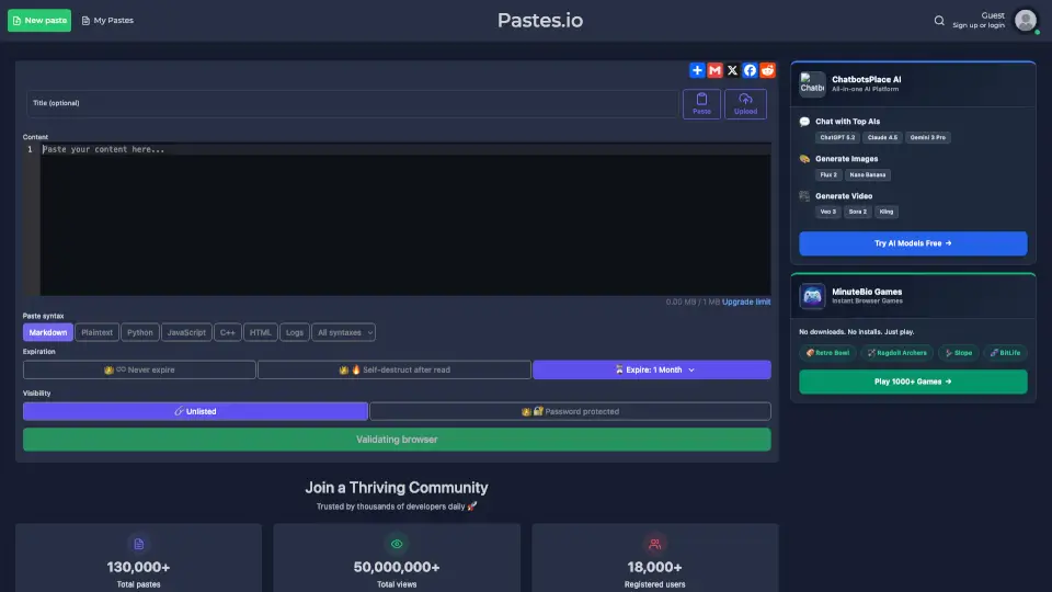 Pastes.io ist die sichere und schnelle Alternative zu Pastebin, die Entwicklern und Kreativen das Teilen von Texten und Code erleichtert. Mit Pastes.io kannst du mühelos speichern, teilen und zusammenarbeiten, ohne dir Sorgen um die Sicherheit machen zu müssen.