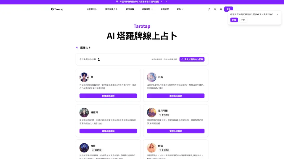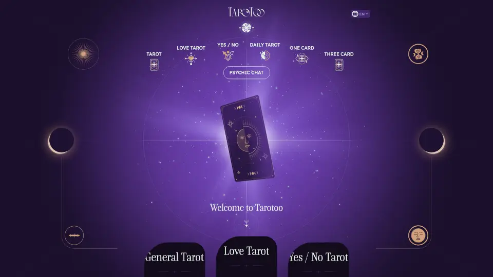 Entdecken Sie die magische Welt von Tarotoo, einer innovativen Plattform für kostenlose Tarot- und psychische Lesungen. Hier können Sie die Geheimnisse Ihrer Vergangenheit, Gegenwart und Zukunft erkunden, ohne sich registrieren zu müssen!