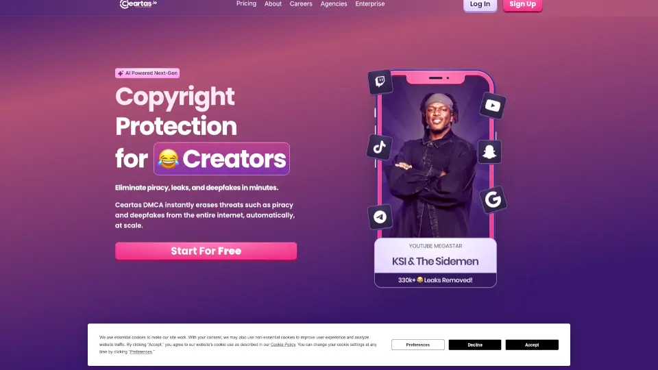 Ceartas DMCA bietet KI-gestützten Urheberrechtsschutz für Content Creator, Influencer und Unternehmen. Mit schnellen Entfernungen und umfassendem Brandschutz ist Ceartas die erste Wahl für digitale Sicherheit.