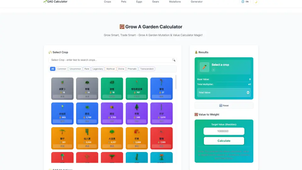GAG Calculator es tu herramienta definitiva para dominar Grow A Garden en Roblox. Con cálculos 99.9% precisos, te ayuda a saber el valor de tus cultivos, mutaciones y ganancias al instante. ¡Sin complicaciones y totalmente gratis!
