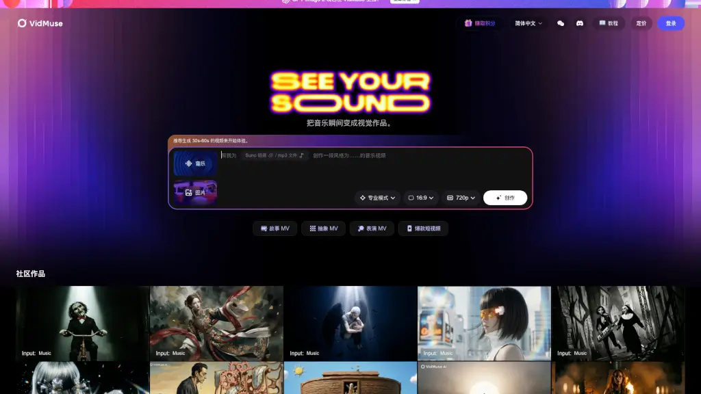 VidMuse transforma tu música en videos musicales profesionales y atractivos, ideal para artistas de Suno, Udio y Spotify.