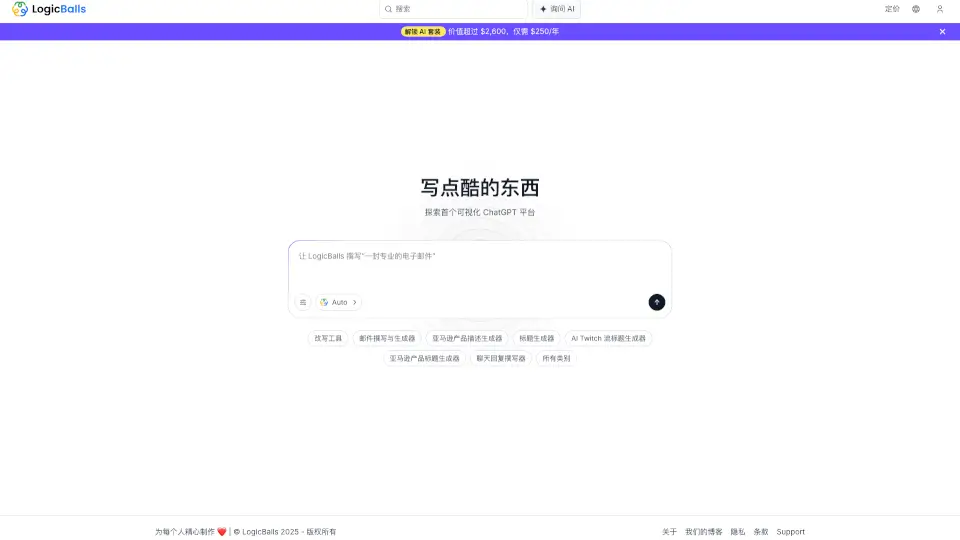 LogicBalls est un outil d'écriture et de création de contenu alimenté par l'IA, conçu pour aider les utilisateurs à générer des textes de haute qualité en un temps record. Que vous soyez un professionnel du marketing, un blogueur ou un propriétaire de petite entreprise, LogicBalls vous offre une solution simple et efficace pour créer des contenus engageants.