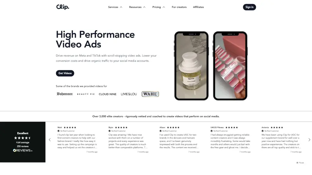 Clip est une plateforme innovante qui connecte les marques avec des créateurs de vidéos de haute qualité. Que vous cherchiez à améliorer votre présence sur Meta, TikTok, ou d'autres réseaux sociaux, Clip vous aide à obtenir des vidéos accrocheuses en moins de 7 jours. Ces vidéos, qu'il s'agisse de publicités, de témoignages, de déballages, ou de tutoriels, sont conçues pour captiver l'attention et augmenter vos conversions. Avec plus de 3 000 créateurs soigneusement sélectionnés, Clip garantit que chaque vidéo est de qualité supérieure et alignée avec votre marque.