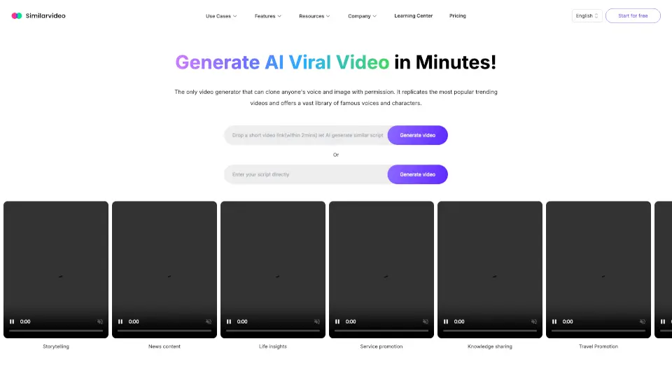 Similarvideo.ai est l'outil ultime pour créer des vidéos marketing virales rapidement et facilement, en utilisant des voix et avatars IA personnalisés.