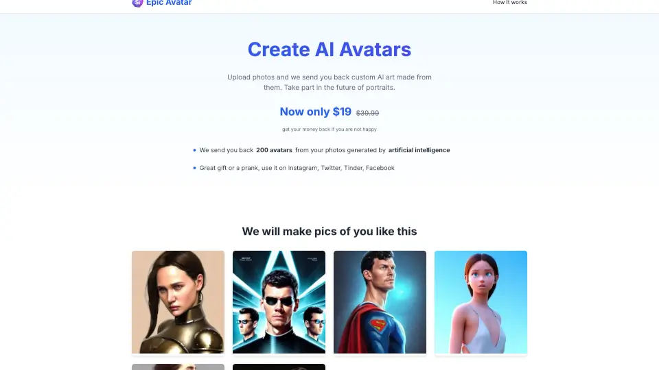 Epic Avatarは、AI技術を活用して200種類のユニークなアバターを生成するプロフィール画像ジェネレーターです。手頃な価格で、SNSやゲームのプロフィール画像として活用できます。