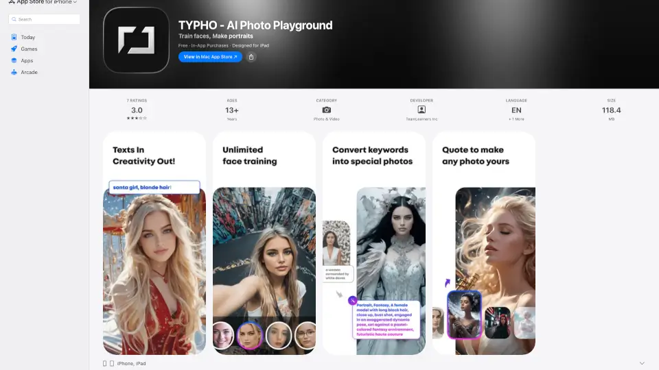 TYPHO - AI Photo Playgroundは、AIを使ってテキストから美しいセルフポートレートを作成できるアプリです。想像力を自由に発揮し、アートの未来を体験しましょう。