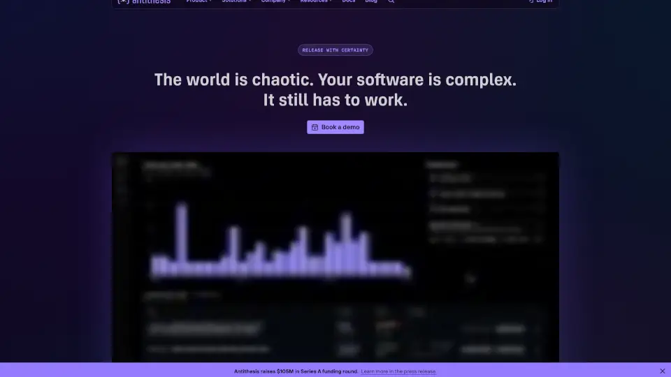 Antithesis é uma plataforma de teste autônoma que encontra bugs no seu software com reprodutibilidade perfeita, ajudando você a corrigi-los de forma eficiente. Com uma abordagem única, ela permite que você libere software mais rápido e seguro, sem gastar tempo excessivo em testes manuais.