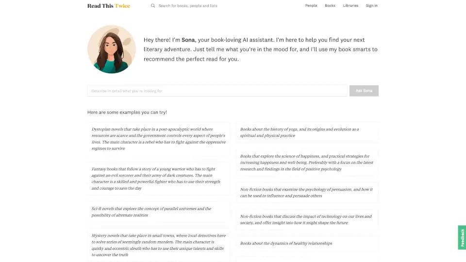 Sona é a assistente virtual perfeita para quem ama livros, oferecendo recomendações personalizadas em diversos gêneros e temas.