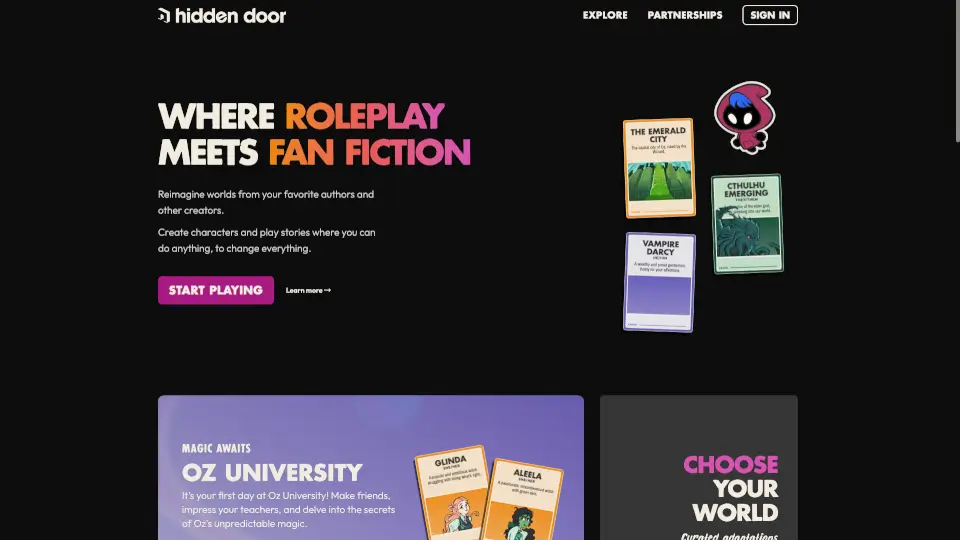Gerador de Fanfic AI: Ferramentas para criar automaticamente histórias de fanfiction, auxiliando os escritores na geração de conteúdo criativo e na exploração de novas narrativas. Explore 3 ferramentas e serviços de IA de alta qualidade para Gerador de Fanfic AI, incluindo, Perchance, Tipsy Chat, Hidden Door