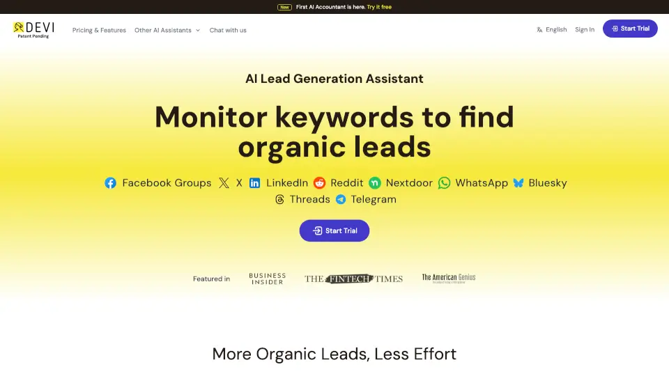 Просмотр деталей: Devi | AI Social Media Leads Monitoring and Outreach ToolDevi — ваш помощник в мониторинге лидов и автоматизации взаимодействия в социальных сетях.