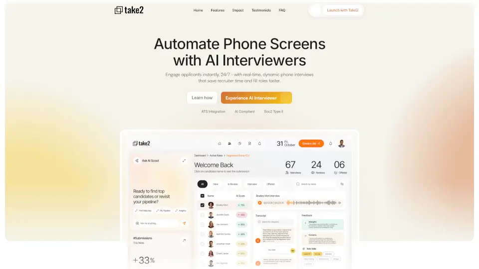 Take2 透過 AI 模擬自動化招聘流程,幫助企業節省時間、提升留任率,並精準識別頂尖人才。